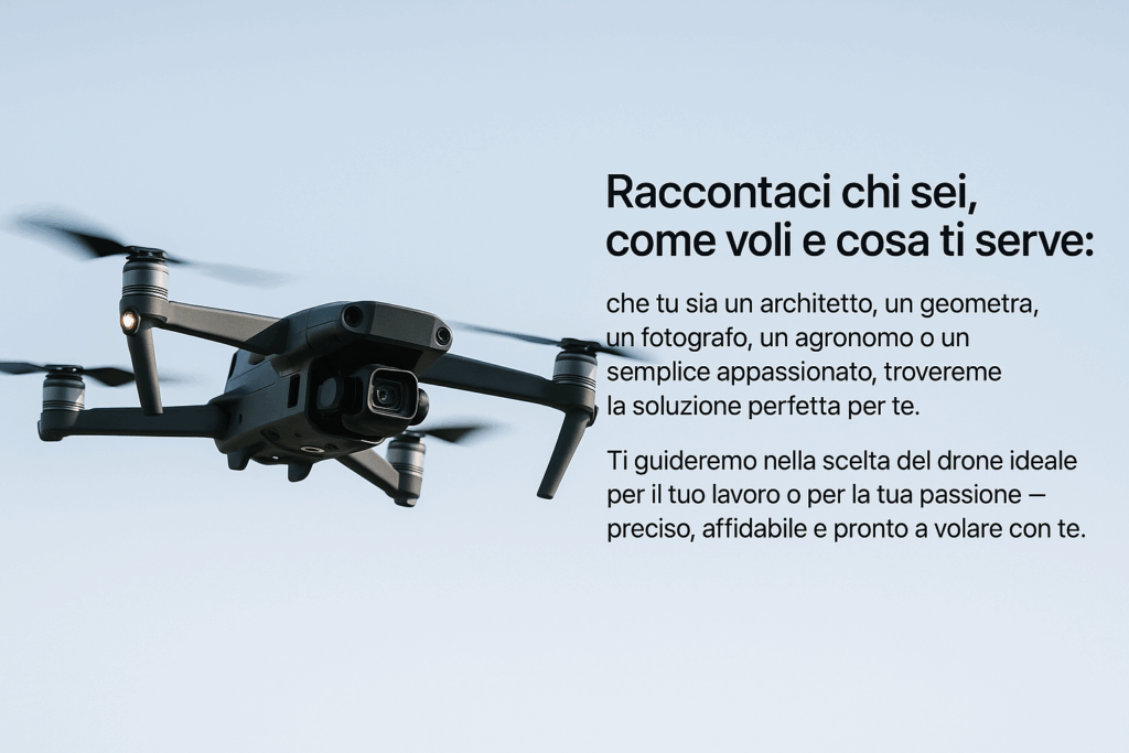 Che tu sia un architetto, un geometra, un fotografo, un agronomo o un semplice appassionato, troveremo la soluzione perfetta per te. Ti guideremo nella scelta del drone ideale per il tuo lavoro o per la tua passione โ preciso, affidabile e pronto a volare con te.